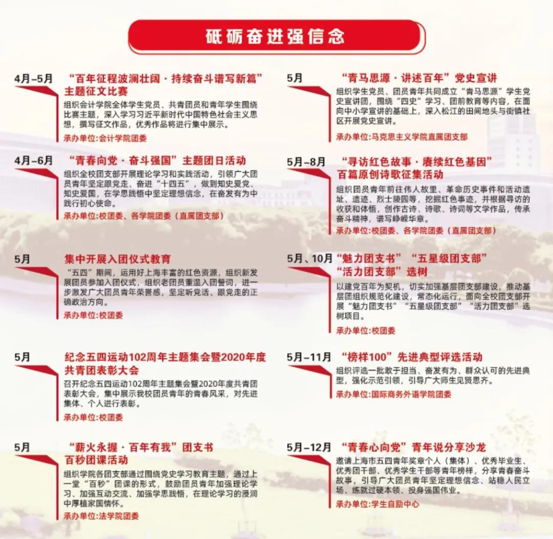 清单包括:“凝心聚力学党史”“砥砺奋进强信念”“高擎旗帜跟党走”三个系列,共30项重点项目,引领团员青年重温党的光辉历史,感悟党的初心使命,领会党的创新理论,体认党的精神谱系,传承党的红色基因。