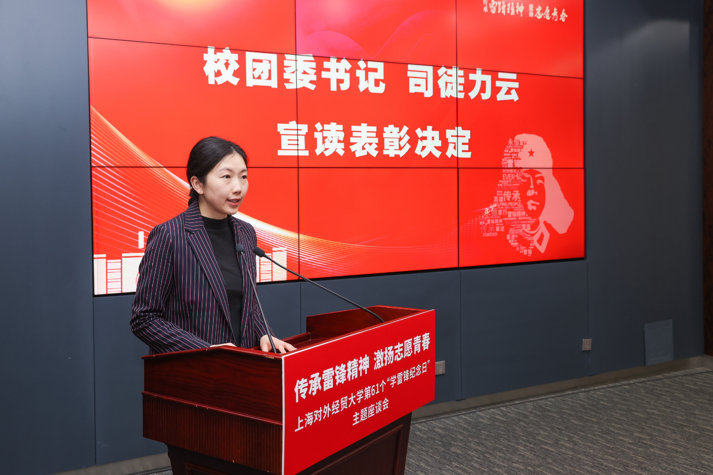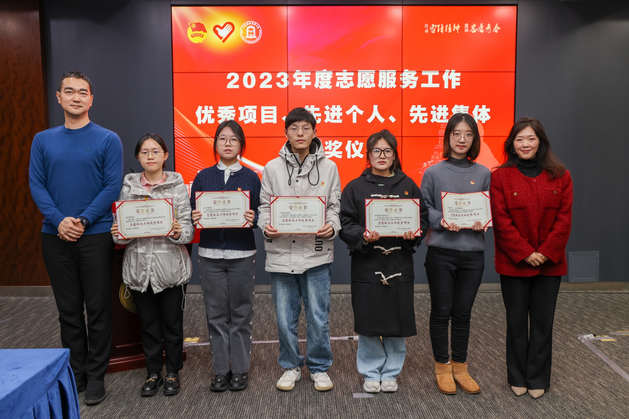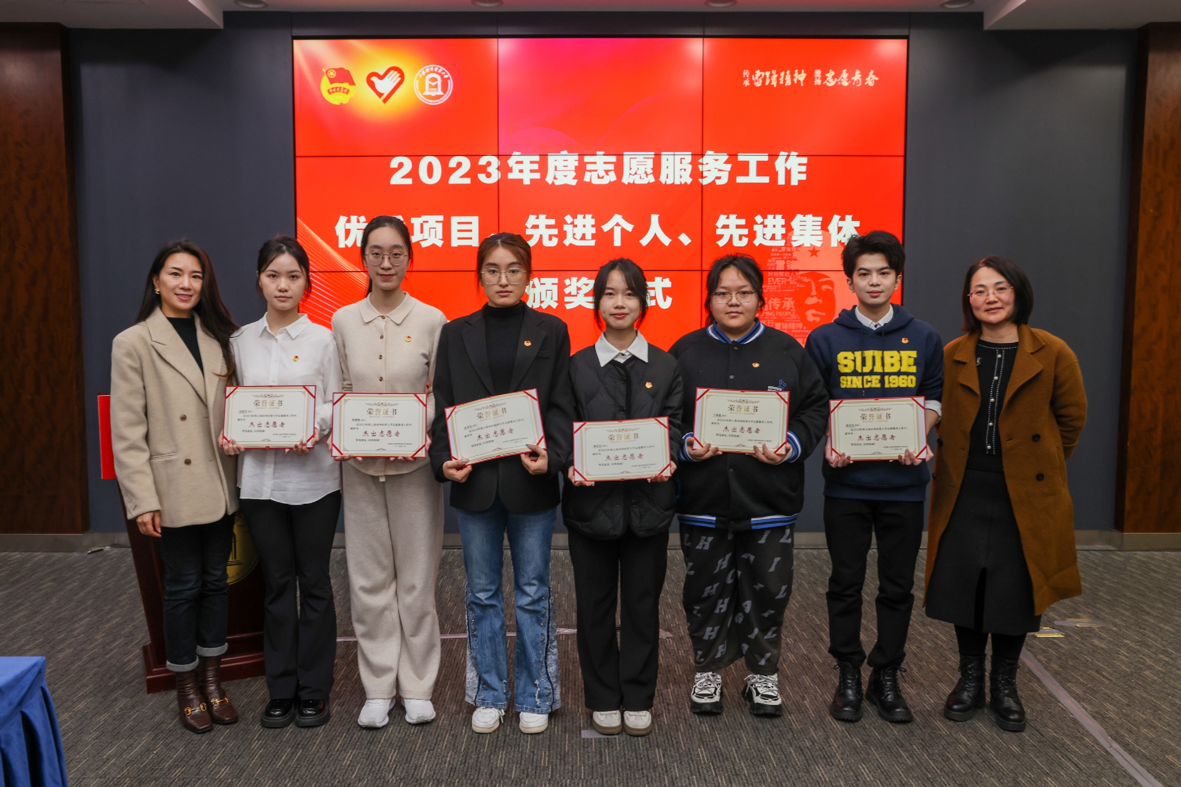 校团委书记司徒力云宣读《关于表彰2023年度上海对外经贸大学志愿服务工作先进集体、优秀项目、先进个人的决定》。经评选,会计学院团委等3个集体获评“志愿服务工作先进集体”称号,“救在身边”急救知识普及服务等5个项目获评“志愿服务工作优秀项目”称号,郭彦君、王锶锶等10名学生获评“杰出志愿者”称号,沈佳洁、胡敏君等36名学生获评“优秀志愿者”称号。