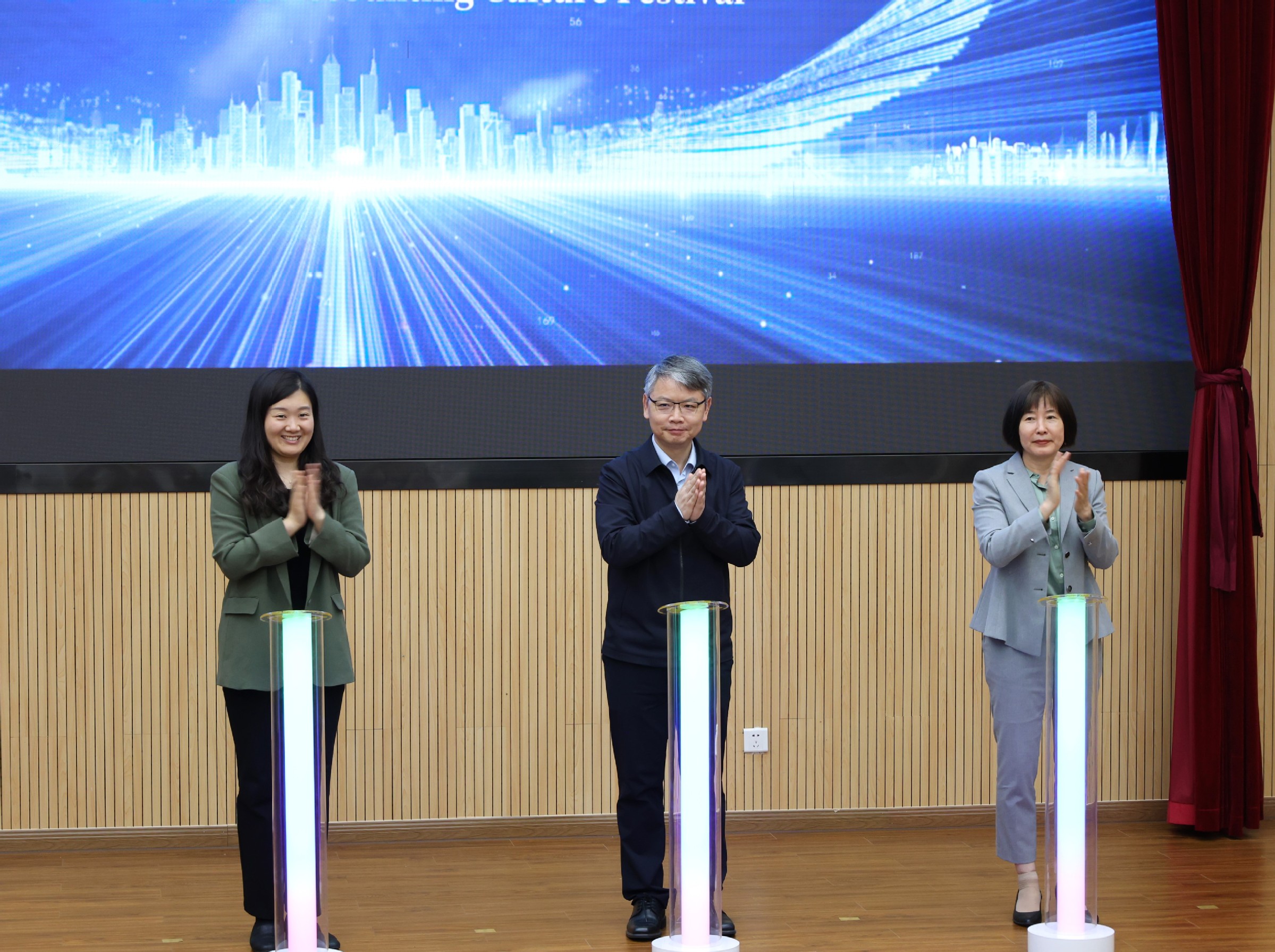 启动仪式上,祁明、裴瑱、缪韵笛共同启动开幕装置,光芒映射出上海对外经贸大学第八届财会文化节字样,象征着青春奋斗之光,必将厚积薄发,实现人生梦想。