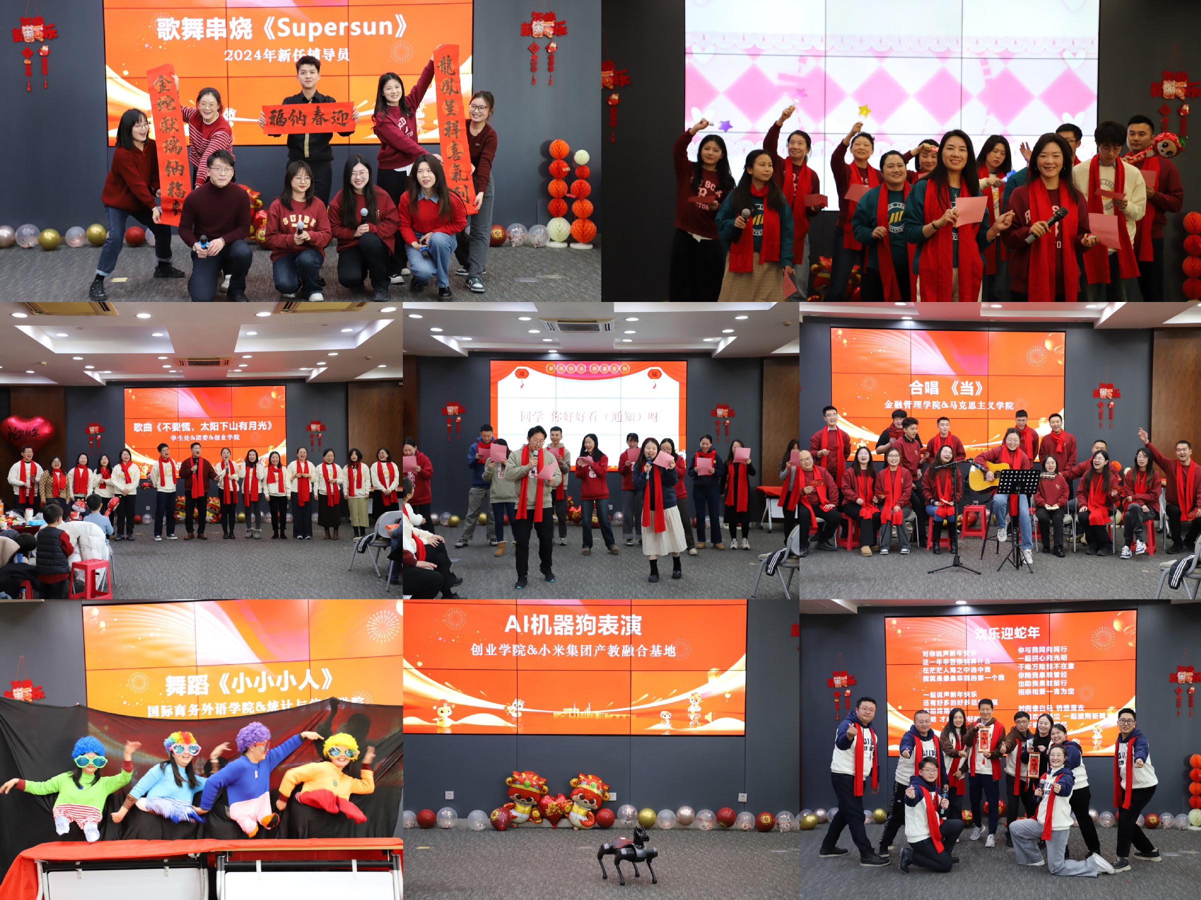 团拜会上节目精彩纷呈,充分展现出学工系统教师们的活力与创意。第一篇章“育新·蚺蚺顺遂”中,2024年新任辅导员的歌舞串烧《Supersun》为团拜会拉开序幕,“特别嘉宾”小米AI机器狗呈现的表演充分展示出科技与智能的魅力;第二篇章“逐梦·螣螣如意”中,舞蹈表演《小小小人》将团拜会热烈氛围推向高潮;第三篇章“奋进·虬虬事业”中,《欢乐迎蛇年》带领大家在新春的欢乐中畅想未来。