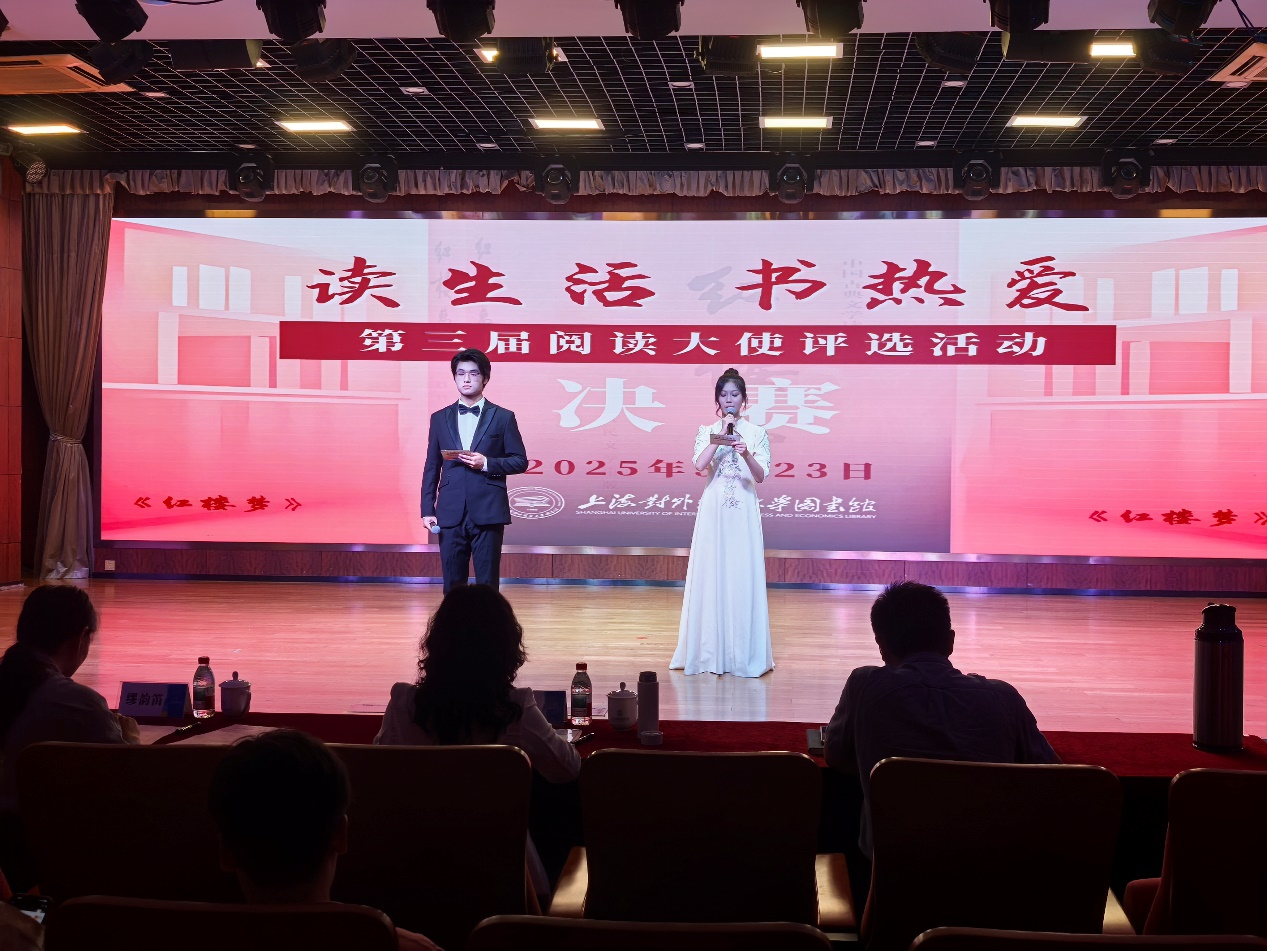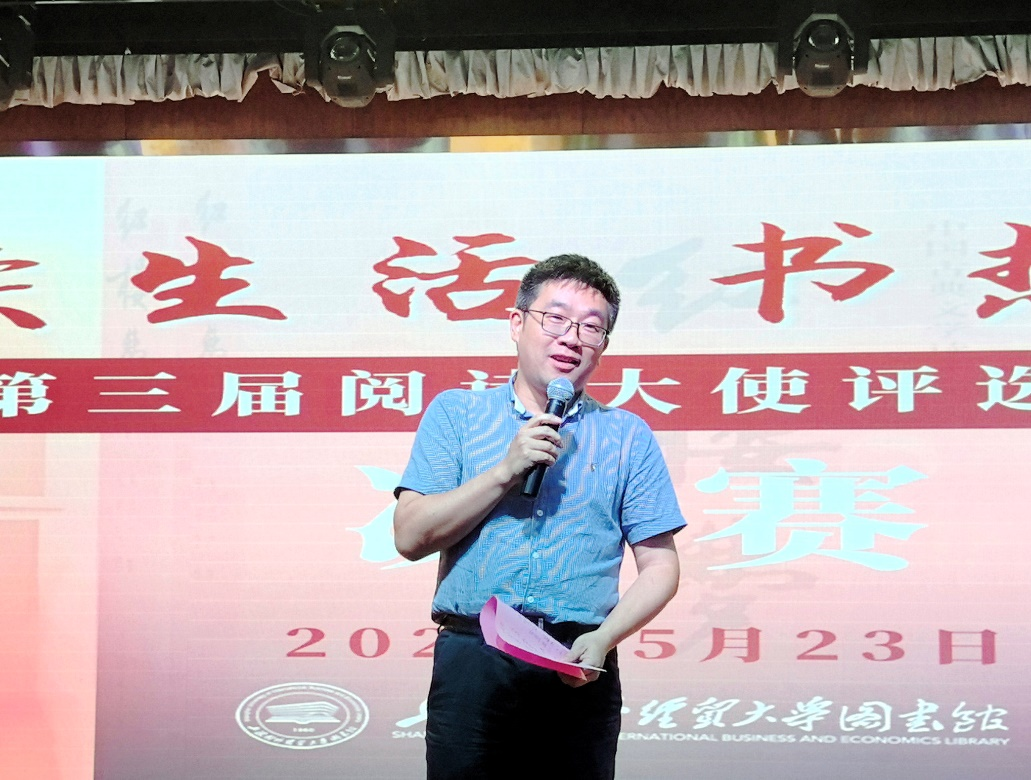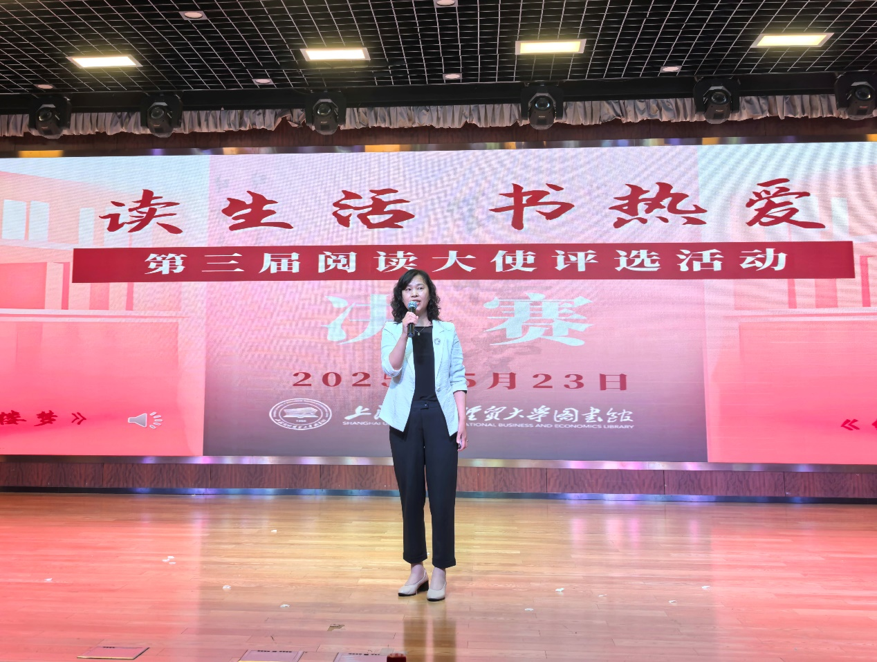 5月23日晚,上海对外经贸大学第三届“读生活,书热爱”校园阅读大使大赛决赛在松江校区图文信息大楼507报告厅顺利举行。决赛评委图书馆馆长王群、学生处处长缪韵笛、党委宣传部副部长施晖,参赛选手与共演者以及师生观众200余人出席活动。