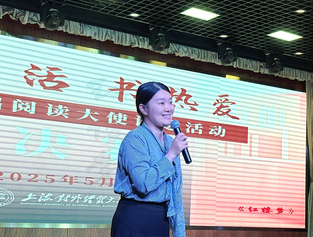 最后,王群进行活动总结。她指出,在“快餐文化”盛行的时代,同学们仍能坚守深度阅读、保持热忱,值得称赞。本届活动“读生活,书热爱”阅读大使大赛以《红楼梦》为共读书目,有效促进了学生对经典的深入研读,激发了广泛阅读热情。评委的专业点评、观众的积极参与,选手展现的阅读感悟力、艺术表现力和语言表达力,都彰显了经典名著的持久影响与中华优秀文化的时代活力。期待各位阅读大使未来在书香校园建设中发挥更大的作用,点燃更多青年学子对中华文化的热爱,为文化传承与发展注入源源不断的青春力量。