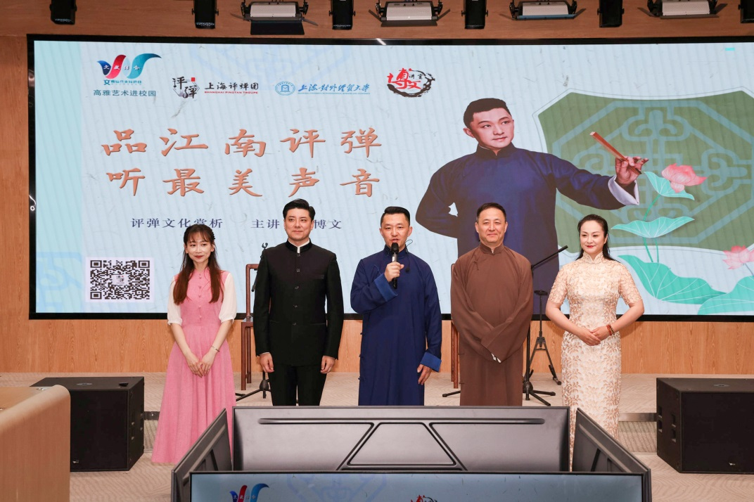 5月27日下午,一场别开生面的非遗文化赏析课在上海对外经贸大学松江校区图文信息大楼213室举行。上海评弹团团长高博文带领一级演员姜啸博、陆嘉玮、朱琳、青年演员姚依依为学校师生作主题为“品江南评弹,听最美声音”的评弹演出与赏析。本次活动为上海市教委高雅艺术进校园项目,也是学校第63期博文讲堂。
