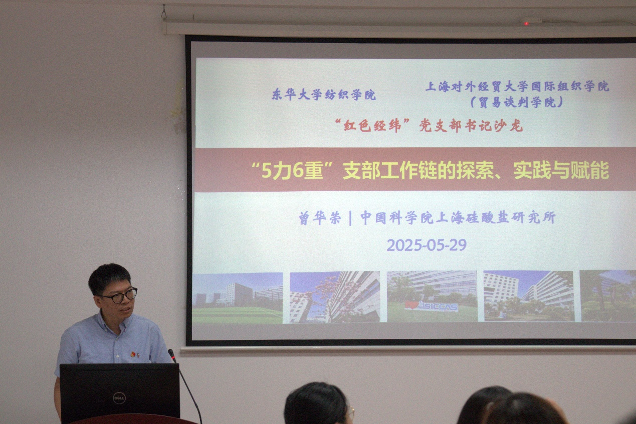 5月29日,上海对外经贸大学国际组织学院(贸易谈判学院)党委与东华大学纺织学院党委在东华大学纺织学院会议室开展共建活动,并联合开展“红色经纬”党支部书记沙龙活动?;疃胫泄蒲г荷虾9杷嵫窝芯克畔⒐δ懿牧嫌肫骷芯恐行牡持Р渴榧窃僮髦魈饨沧6笱Х闹г旱澄榧抢罴岩?、上海对外经贸大学国际组织学院(贸易谈判学院)党委书记刘素贞、东华大学纺织学院党委副书记寿晨燕、上海对外经贸大学国际组织学院(贸易谈判学院)党委副书记程栋出席活动,双方教师党支部书记、部分教师党支部委员、学生党支部书记、专职组织员、专职党务干部、学生党建辅导员参加活动?;疃衫罴岩鞒?。