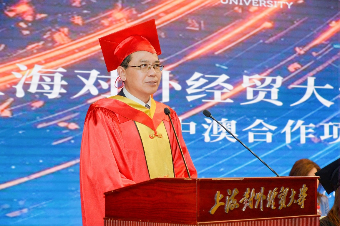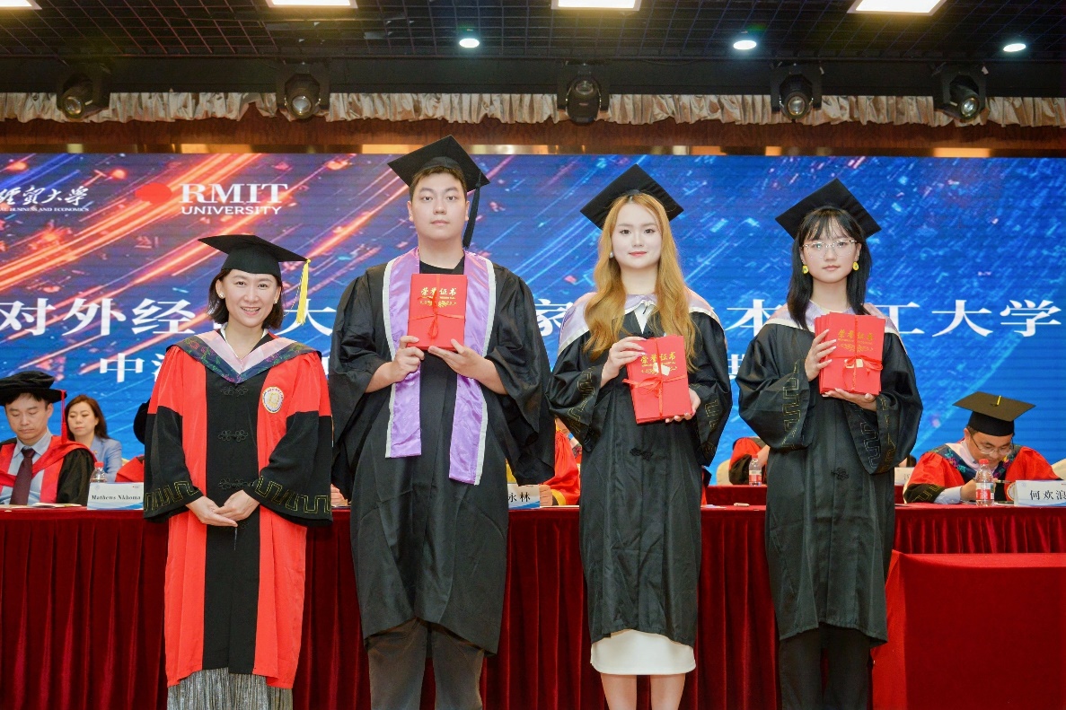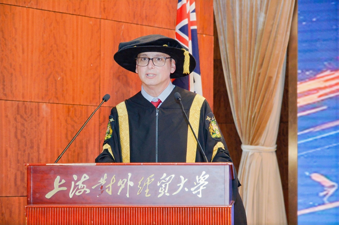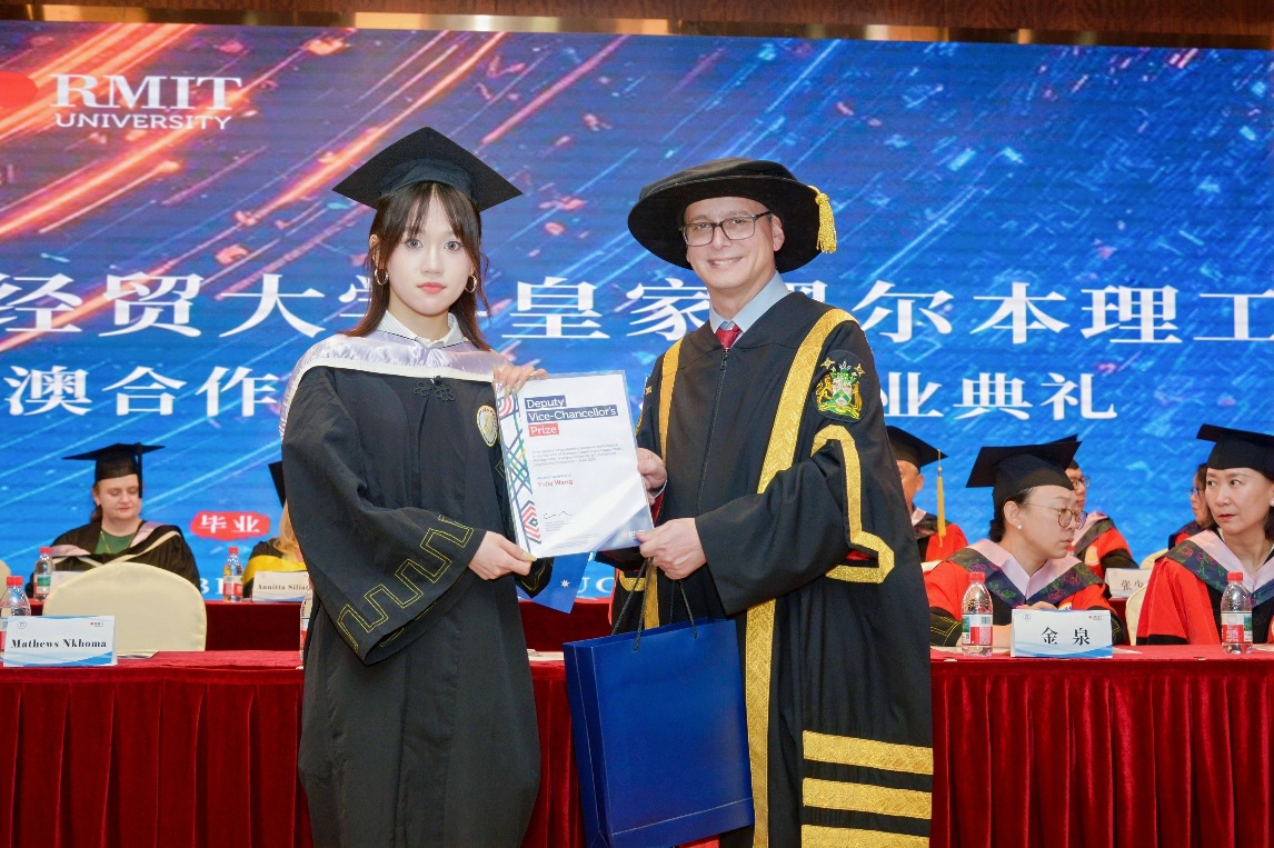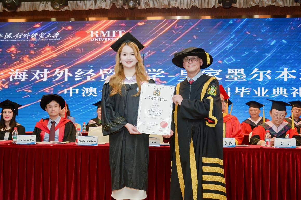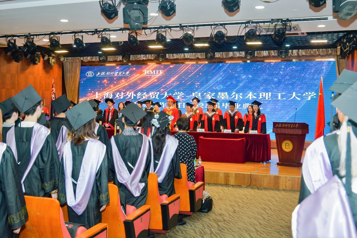 6月19日下午,我校中澳合作项目2025届毕业典礼在松江校区信息楼507报告厅隆重举行。皇家墨尔本理工大学(RMIT大学)主管法商学部的副校长Colin Picker、RMIT大学教务长Connie Merlino、RMIT大学主管战略和国际事务的法商学部副部长Mathews Nkhoma,上海对外经贸大学副校长徐永林、外事处处长金泉、国际经贸学院党委书记张嵘、院长何欢浪、学院党委副书记陈雪、副院长沈克华,RMIT上海校友会主席潘悦婷,以及中澳合作项目教师、毕业生家长等嘉宾应邀出席毕业典礼。