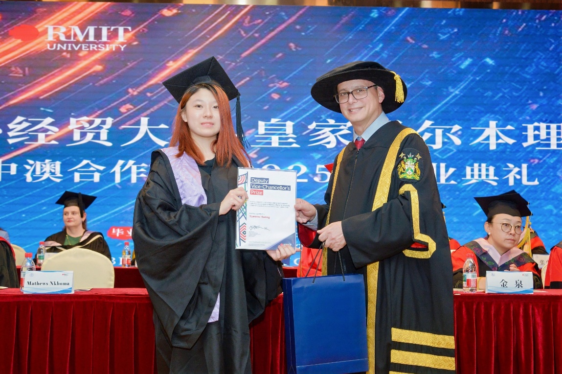 Colin Picker为获得“皇家墨尔本理工大学法商学院院长奖”的国际商务专业肖瑞欣,物流管理专业王煜洁和副学士项目黄玥雯三位毕业生分别颁发获奖证书和奖品。