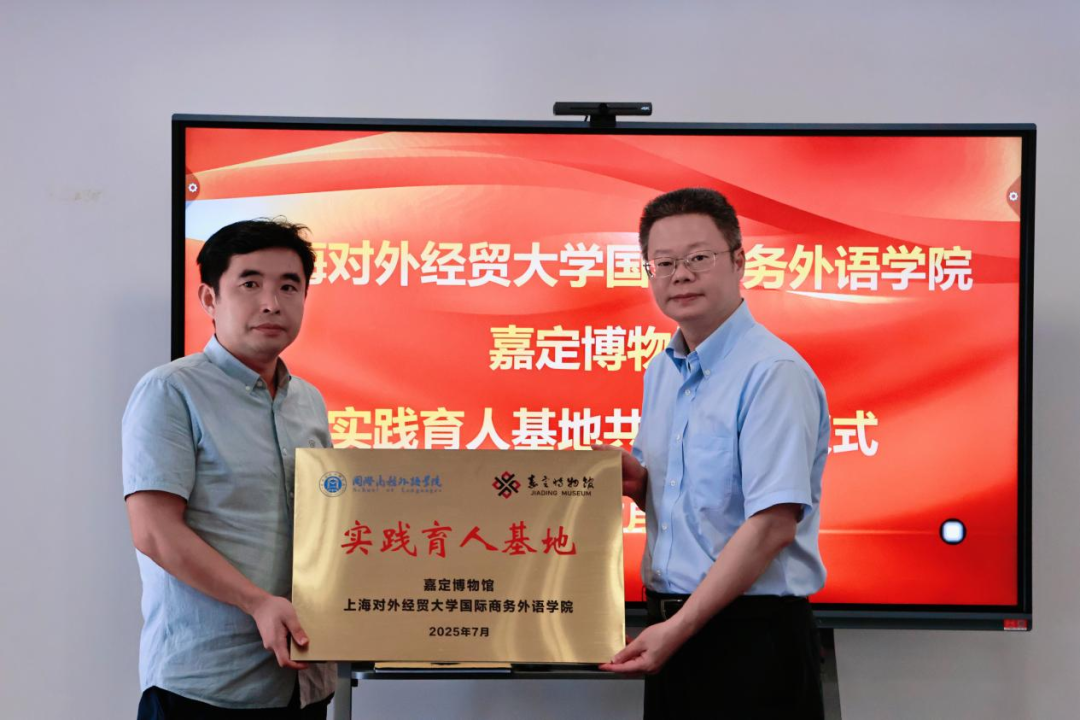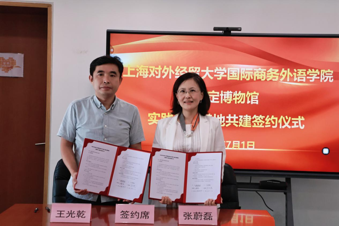 基于此共识,上海对外经贸大学国际商务外语学院与嘉定博物馆现场签署实践育人基地共建协议,章益国与王光乾为基地揭牌。随后,双方就依托基地组建联合研究团队、推动人才双向交流,构建长效协同育人机制进行了深入交流。