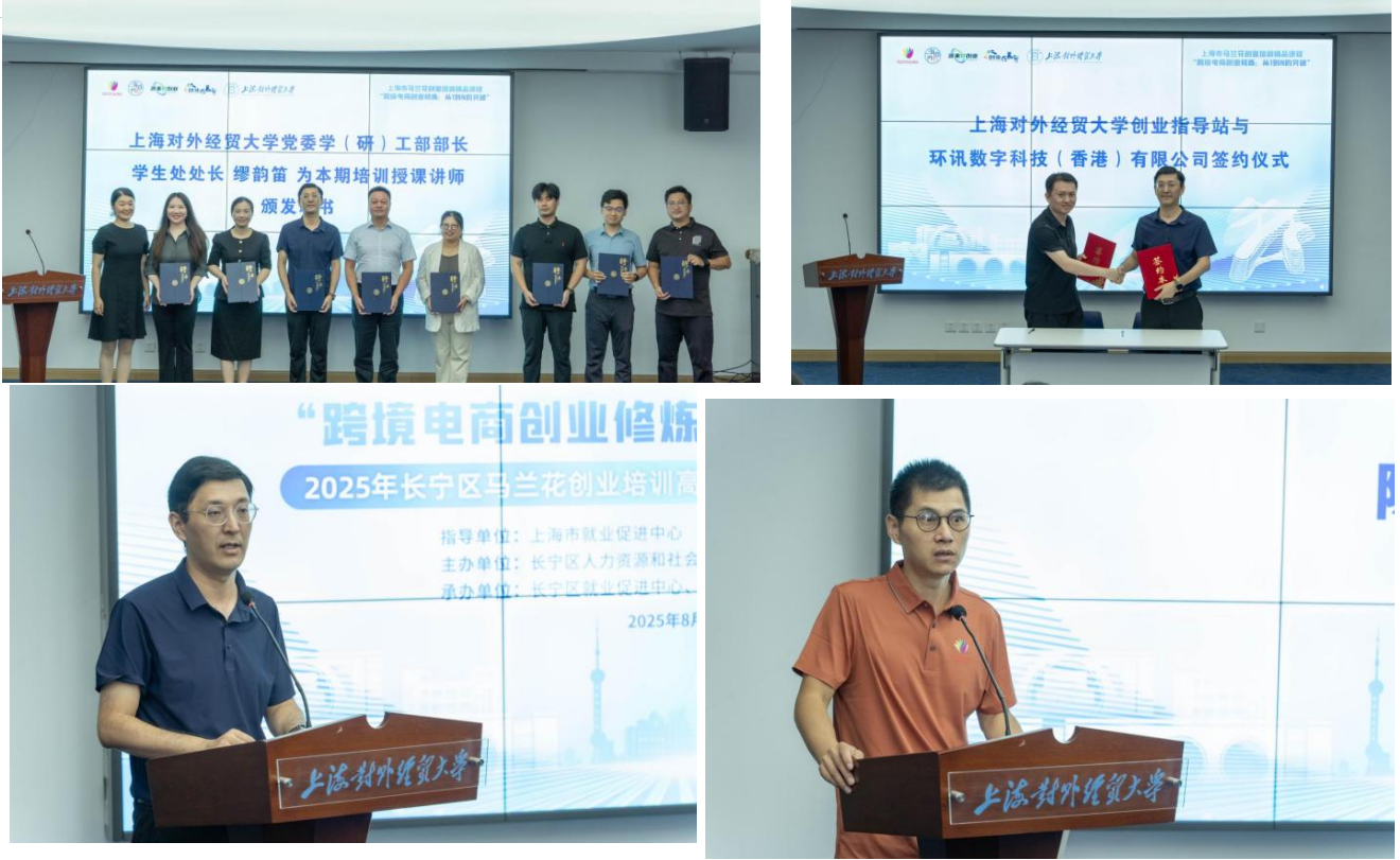 在仪式上,缪韵笛为由“高校+企业”组成的授课团队颁发聘书。上海对外经贸大学创业指导站与环讯数字科技(香港)有限公司签约,共同推动跨境电商创业项目成果转化。高伟和陈圣秋作为教师代表和学员代表分别发言。