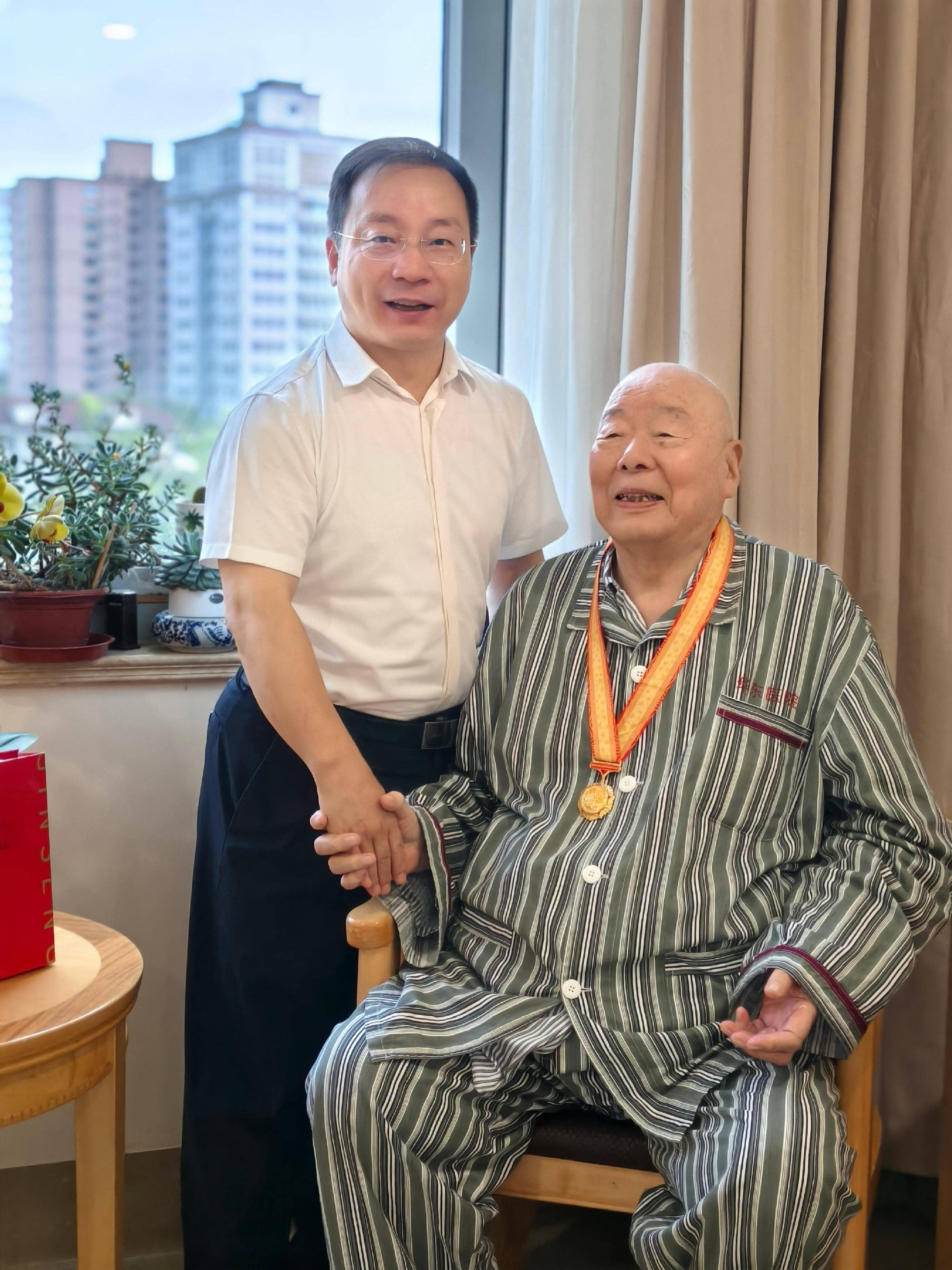 8月20日,学校党委副书记吴毅前往华东医院看望慰问张杰,为其郑重颁发并佩戴“中国人民抗日战争胜利80周年纪念章”。