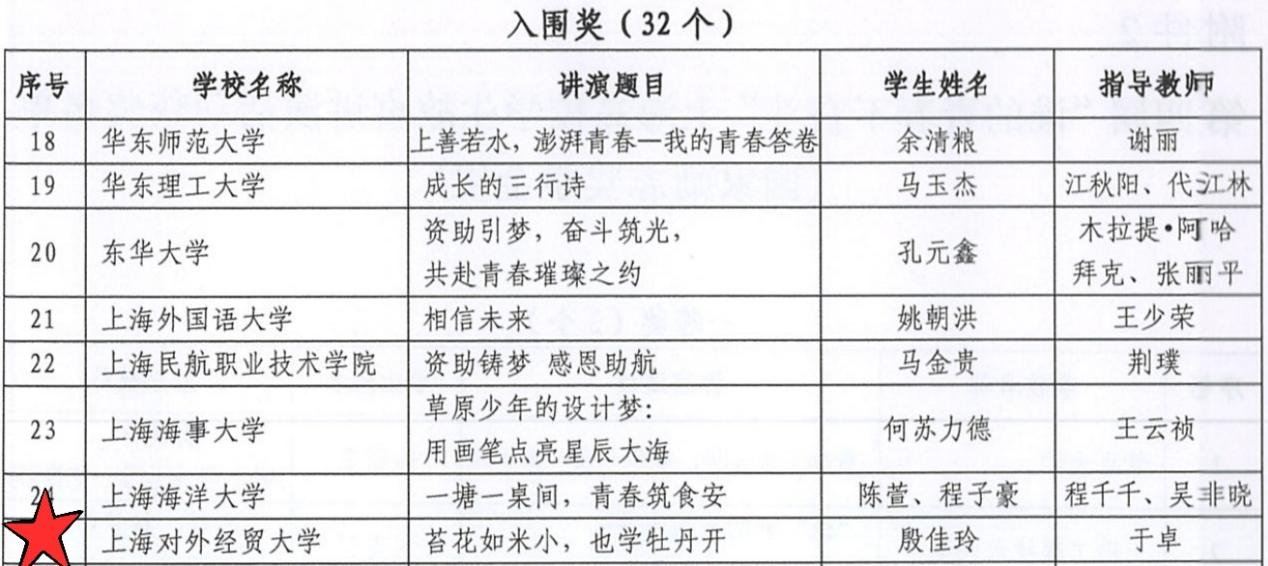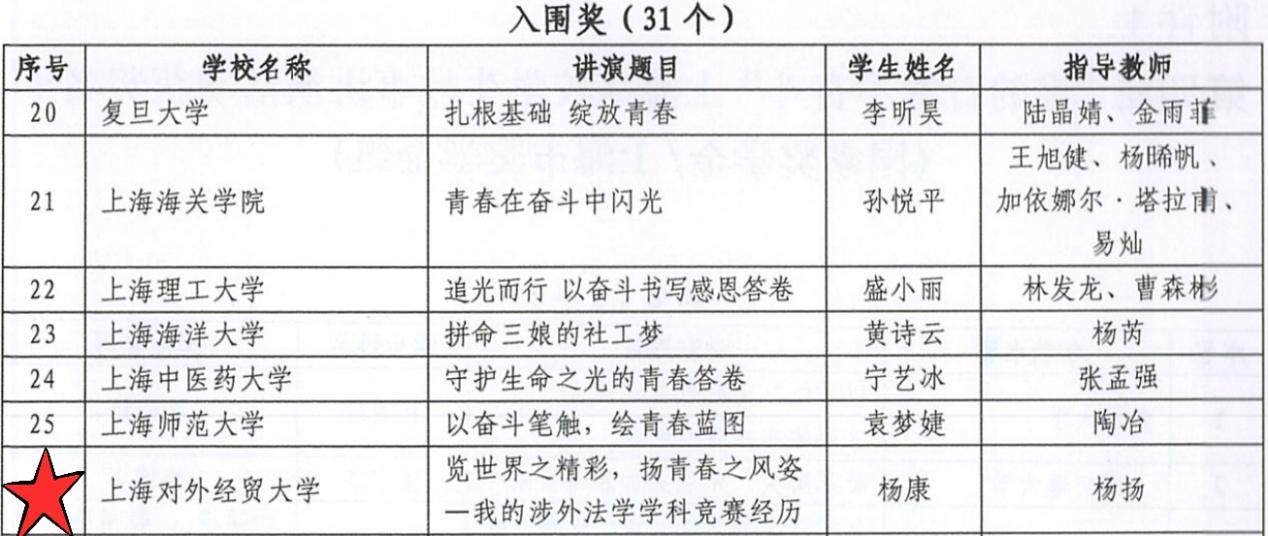 此外,法学院杨康同学、国际经贸学院殷佳玲同学分别荣获“国家奖学金/上海市奖学金组”“国家励志奖学金组”入围奖,他们的表现同样精彩。