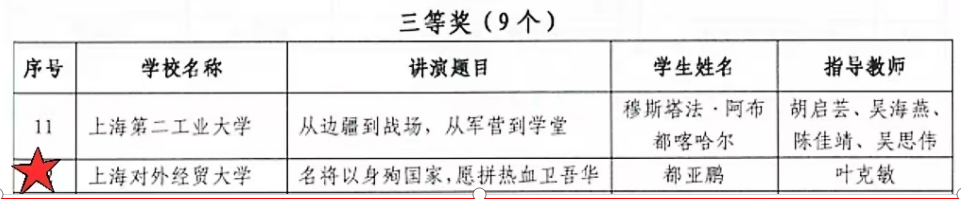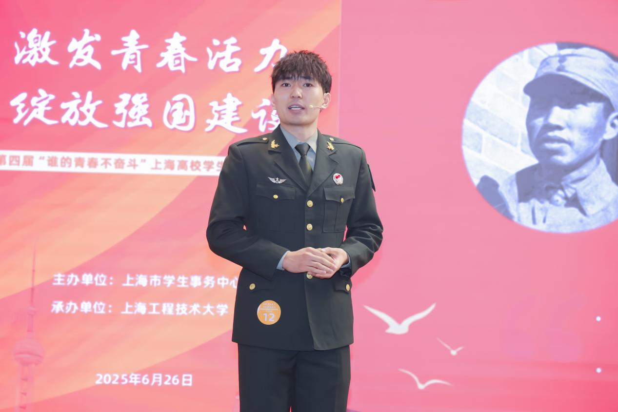 经高校初选、市级视频复选、市级现场遴选,近日,第四届“谁的青春不奋斗”上海市高校学生故事讲演活动结果公布,我校工商管理学院都亚鹏同学荣获“退役士兵组”三等奖。决赛现场,他以“名将以身殉国家,愿拼热血卫吾华”为题,讲述了自己受家庭影响参军入伍,在英雄命名的部队中刻苦锻炼报效祖国的故事。退役复学后,他享受了党和国家给予退伍大学生的系列资助政策,将在军队中学到的团队协作和无私奉献的精神应用到大学学习和生活中,积极参加各类国防教育活动,以实际行动将军人精神、军队精神传播给更多的人,用他的亲身经历,讲述军人的荣誉与责任,展现军人的英勇与坚韧。