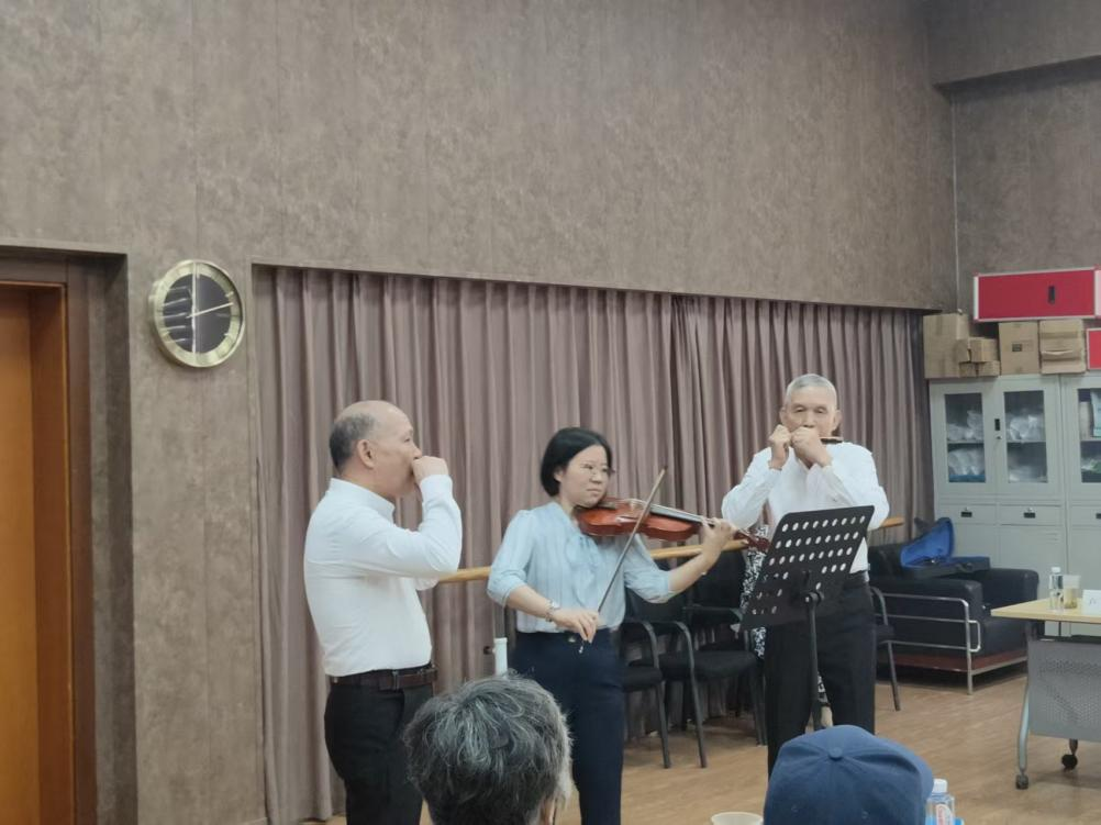 精彩的助兴表演轮番上演,为祝寿会增添了更多欢乐与喜庆。节目依次为:董雅兰、陶影影老师带来钢琴联奏《世界赠予我的》;沈建华、莫怡、龙毛忠、董雅兰、章元乐、卢敏、于蕾、仇丽芳老师共同演唱沪歌《唱支山歌给党听》;仇丽芳老师带来舞蹈《回娘家》;王铮、徐家仪、徐静老师带来乐器合奏《光阴的故事》;董伊金、徐家仪、金道明、王铮、徐敏、沈建华老师带来男声小组唱《太行颂》。