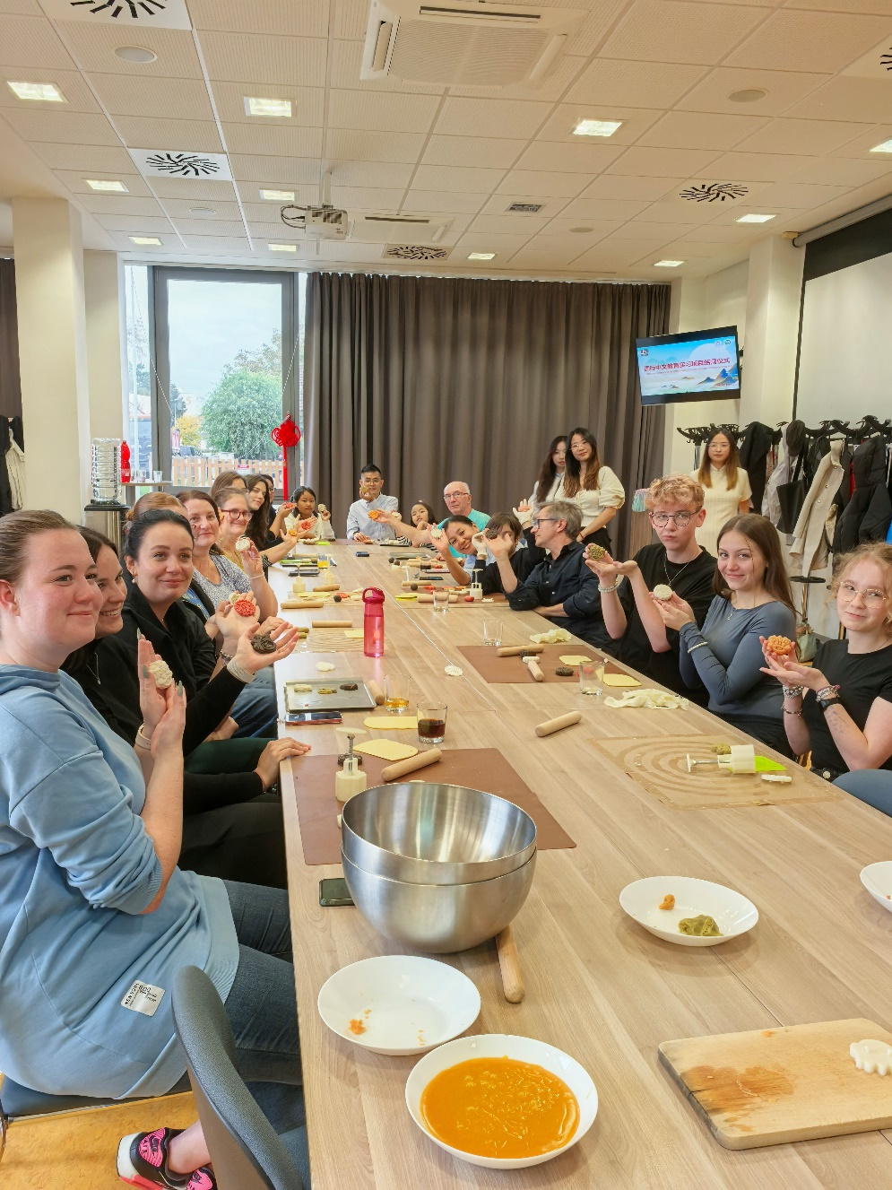 9名参与实践项目的学生还走进布杰孔堂,开启了“月饼工坊”文化盛宴,为实习旅程画上温馨句点。主讲同学为孔堂学员们讲述月饼的来历与寓意,从“嫦娥奔月”的传说到中秋团圆的期盼,再延伸至中国传统寓言故事,把文化的种子播撒在大家心间。工坊里,孔堂为同学们准备了多样口味的月饼皮和馅料,供大家自由搭配。制作步骤看似简单:将月饼面团揉成均等圆球,压扁裹馅,再用模具压制。但初次接触的学员们难免手忙脚乱。9位来自中国的“小助教”便化身文化使者,手把手教学,耐心解释制作原理。当一个个印有“中秋”“团圆”字样,刻着嫦娥、月亮、兔子图案的精巧月饼从模具中诞生,学员们的惊喜溢于言表?;疃詈?,大家手持自己的月饼作品合影留念。