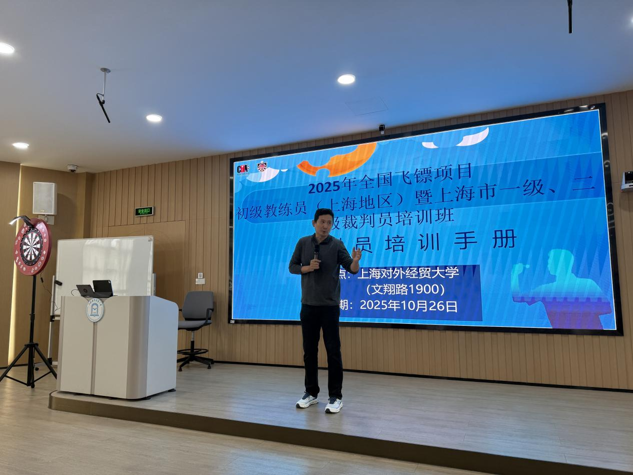为推动飞镖运动标准化、规范化发展,提升全国飞镖裁判与教练队伍的专业素养,由中国飞镖协会主办、上海市飞镖运动协会承办的“2025年全国飞镖项目初级教练员暨上海市裁判员培训班”于10月26日在我校松江校区举办。上海对外经贸大学体育健康学院院长张波、中国飞镖协会培训发展委员会专任导师陈海龙和上海对外经贸大学体育健康学院金何琳老师出席开班仪式。